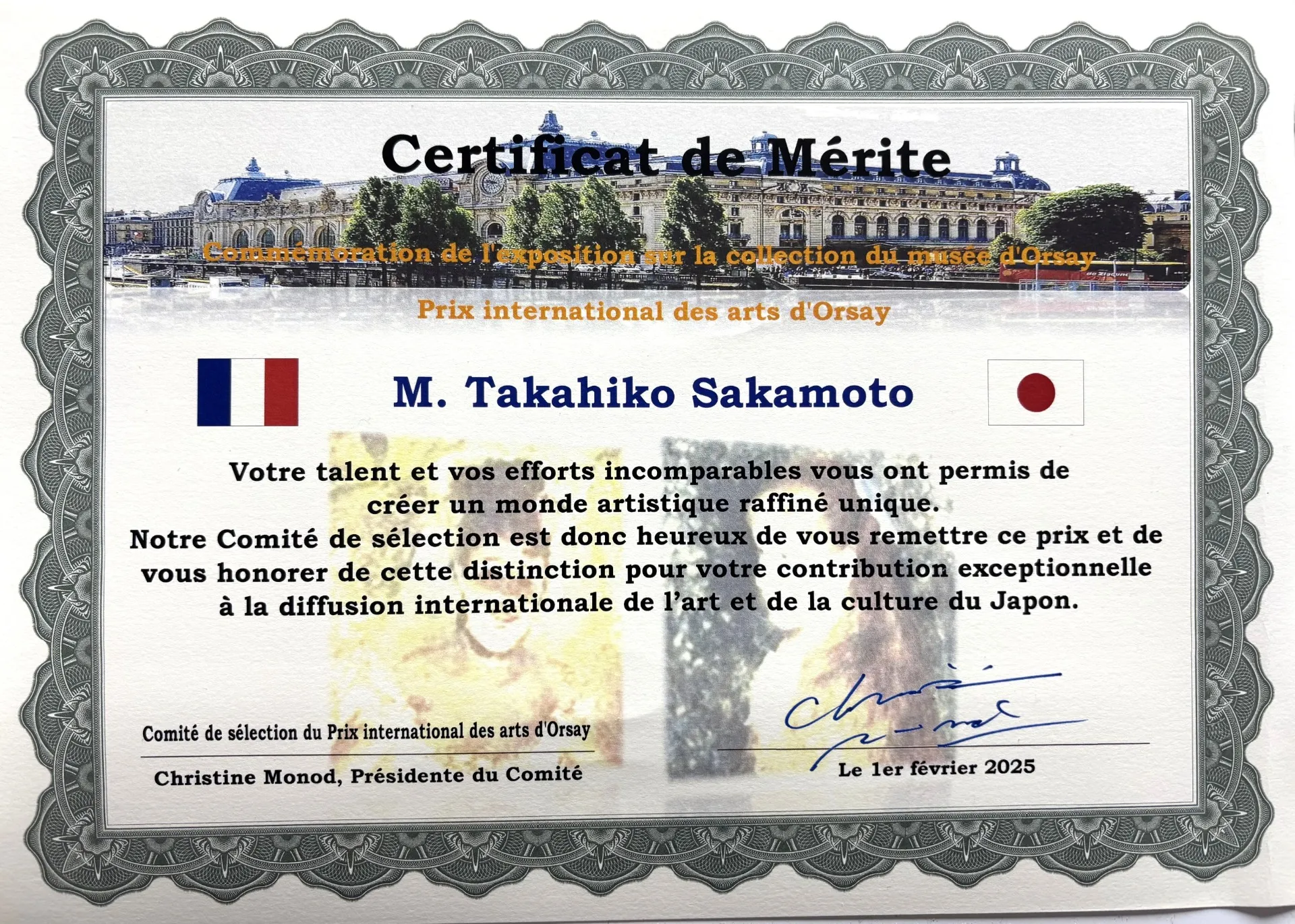 その中で、今回『オルセー国際芸術賞』を受賞したことも分かり、加えて賞状が届いた。(画像①②③)